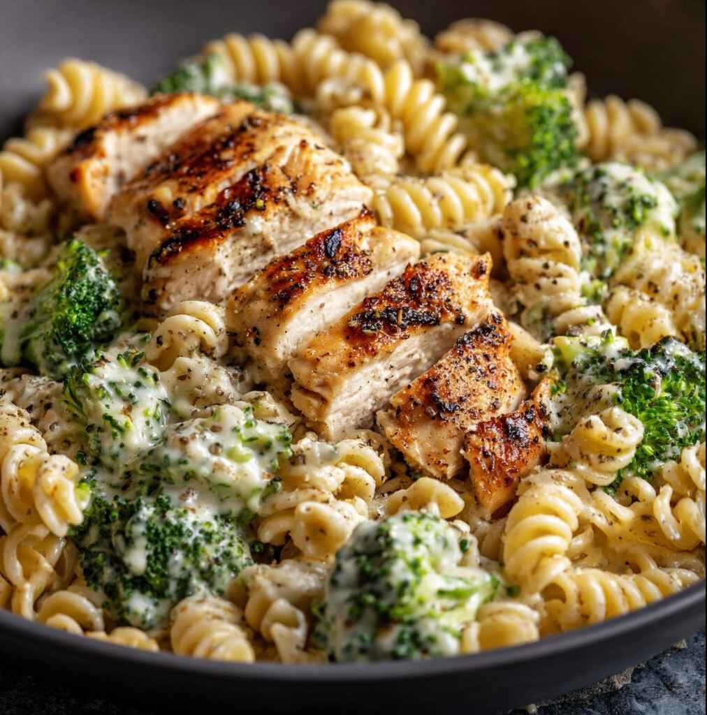 - Add the drained pasta and broccoli to the creamy sauce, tossing gently with tongs to coat evenly. Fold in the shredded rotisserie chicken. If the sauce is too thick, add the reserved pasta water 2 tablespoons at a time until it reaches a glossy, creamy consistency.1 lb penne pasta, 4 cups fresh broccoli florets, 1 whole rotisserie chicken